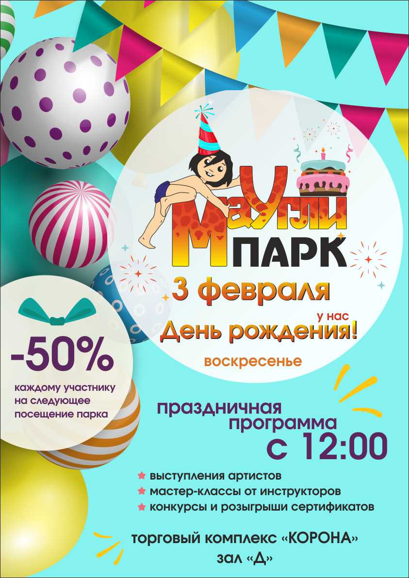 Свершилось. Наконец-то и в Гродно появилось место для уникального суперэмоционального проведения детского дня рождения. "МауглиПарк" предлагает участникам дня рождения не только единственные в Беларуси верёвочные трассы под крышей, общей протяженностью 300 метров, но и скалодромы различного уровня сложности: от занимательных буковок для самых маленьких, до отрицательных уклонов для более подготовленных. Для именинника и его многочисленных гостей предлагается возможность стать участником битвы в лазертаг по мотивам "Звездных войн". Заботливым мамам понравится комната для проведения дня рождения своих маленьких героев.